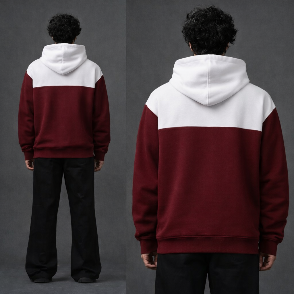 The bold burgundy and off-white colorblock design gives a modern, minimal aesthetic that stands out without being loud. Featuring a relaxed oversized fit, it delivers effortless street style and all-day comfort. The hoodie comes with a double-layered hood, sturdy drawstrings, and neatly finished ribbed cuffs and hem for a clean silhouette.